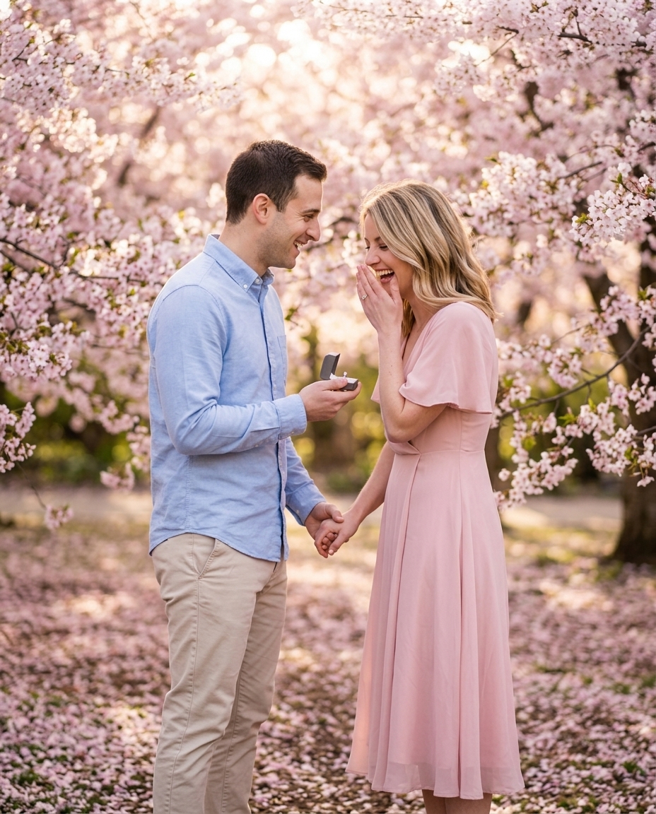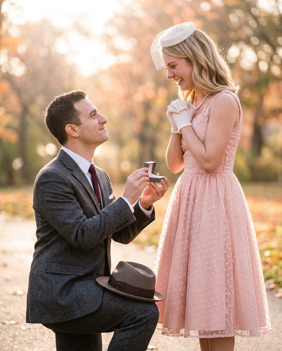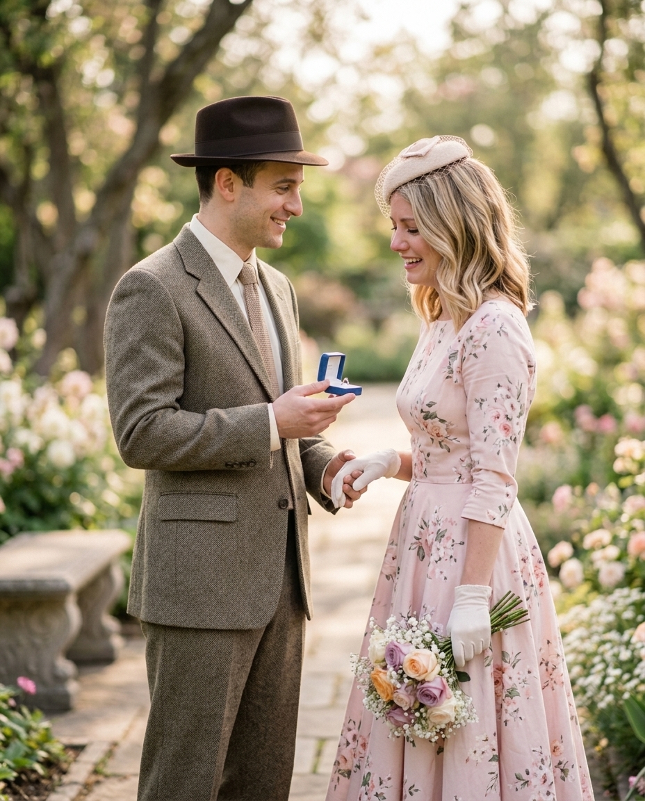 最高の前撮り写真は、人物だけでなく、愛の象徴であるディテールにも重点を置いています。AIを調整して、婚約指輪を中心に映画風(Movie style)のドラマチックな照明とボケ効果を取り入れたクローズアップ(マクロ撮影)画像を生成することも可能です。高額な撮影費用を払うことなく、まるで高級ウェディング誌のような圧倒的な質感とクオリティを演出します。