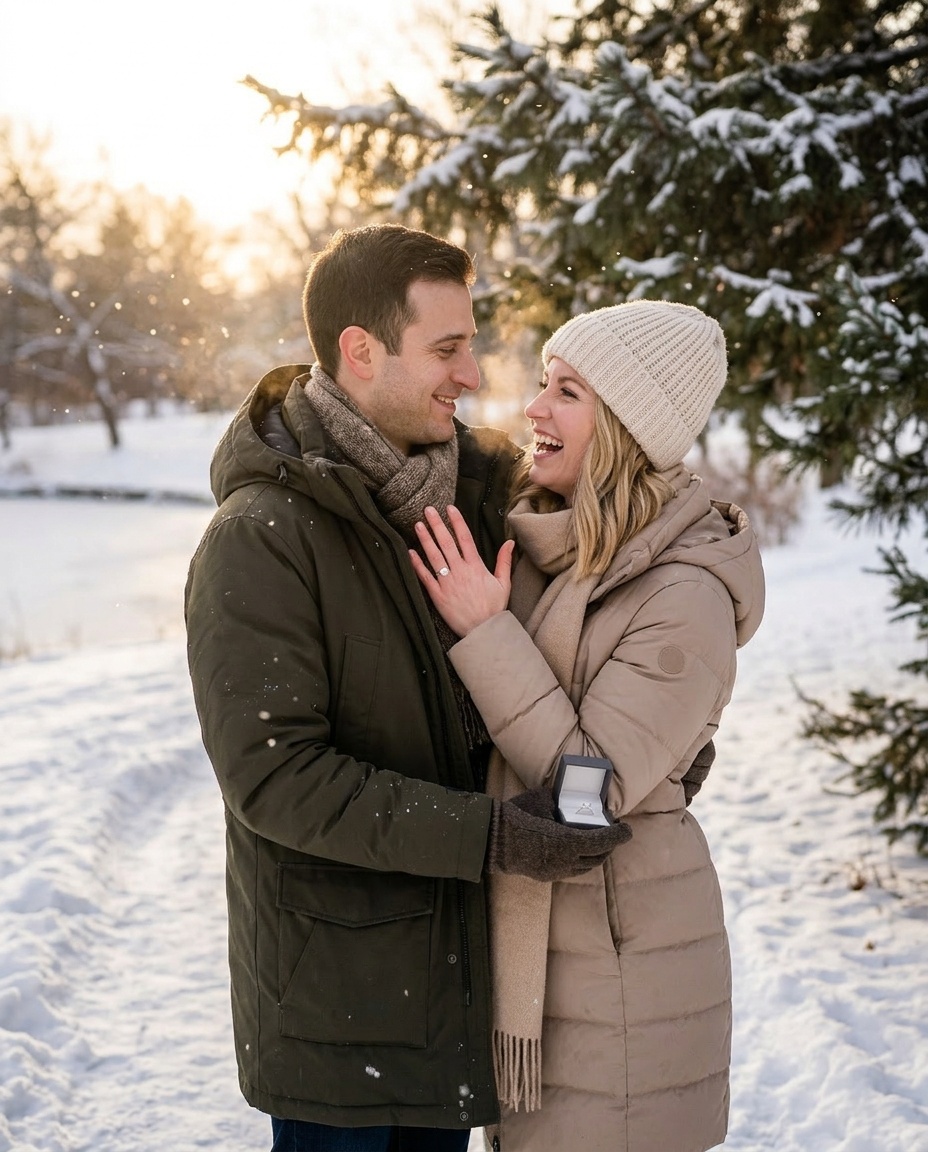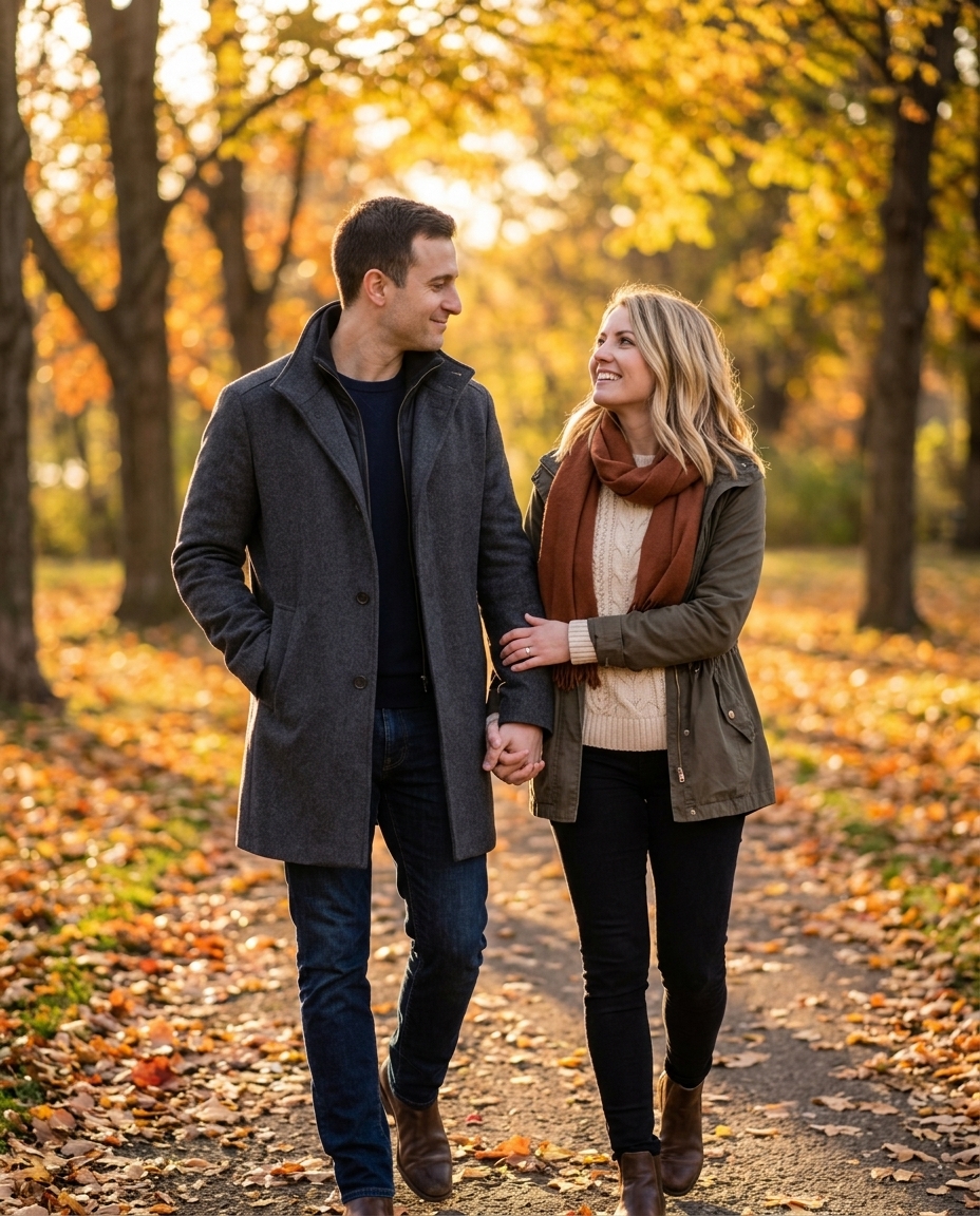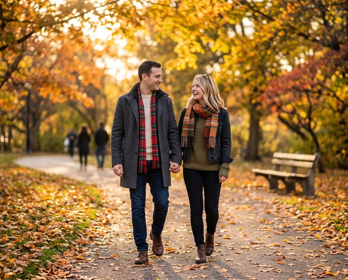 暖かみのある厚手のセーターやマフラーを着て、季節特有のロマンチックな自然の魔法に包まれる心地よい構図です。